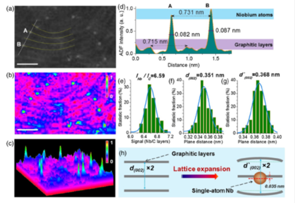 当材料的尺度降低到单原子尺度时,与普通纳米材料相比,其表面原子占有率超过90%,具有极高的活泼性、独特的物理化学性质以及在技术方面潜在的诸多应用。研究团队发挥材料、物理和化学的多学科交叉优势,自主设计了具有高冷却能力的直流电弧等离子体装备,据此合成了具有单原子尺度的金属铌-石墨复合材料。