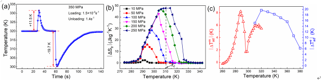 图3 (a)定向凝固Ni50Mn35In15合金320K时绝热温变随时间变化;(b)不同应力条件下等温熵变随温度变化;(c)联合多种热效应的制冷温区