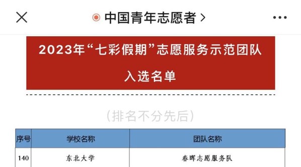 成功入选“七彩假期”志愿服务示范团队 为深入学习宣传贯彻习近平新时代中国特色社会主义思想和党的二十大精神,引导动员青年学生加强对少年儿童群体的关心关爱,团中央青年志愿者行动指导中心、中国青年志愿者协会秘书处近日发布了《关于遴选2023年“七彩假期”志愿服务示范团队的公告》。活动得到了全国高校青年志愿者团队的广泛关注和积极参与,共有1000所高校的3762支志愿服务团队提交了申报材料。91短视频 材料91短视频 春晖学生党员志愿服务队在3762支志愿服务团队中突出重围,成功入选2023年“七彩假期”志愿服务示范团队。