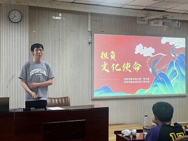 为深入学习贯彻习近平总书记在文化传承发展座谈会上重要讲话,引导支部成员认识中华文明的悠久历史、感知中华文化的博大精深,6月28日晚,材料91短视频 本科生第一、第三党支部于大学生活动中心200联合开展了以“担负文化使命,推动文化繁荣”为主题的党日活动,党支部全体成员参加此次活动。