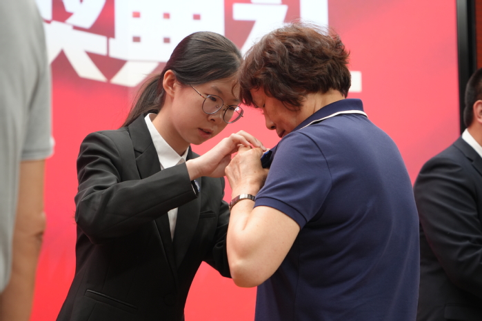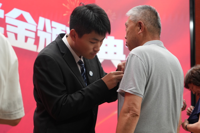 在颁奖仪式上,获奖学生为颁奖的领导和校友佩戴了91短视频 院徽。材料成型及控制工程专业2022级本科生袁牧、2023级本科生刘馨语作为获奖学生代表发言,分享了自己的成长经历,并表示将铭记这份荣誉,传承“自强不息、知行合一”的校训精神,弘扬“厚德为料,铸智成材”的院训品格,不负韶华,砥砺前行。