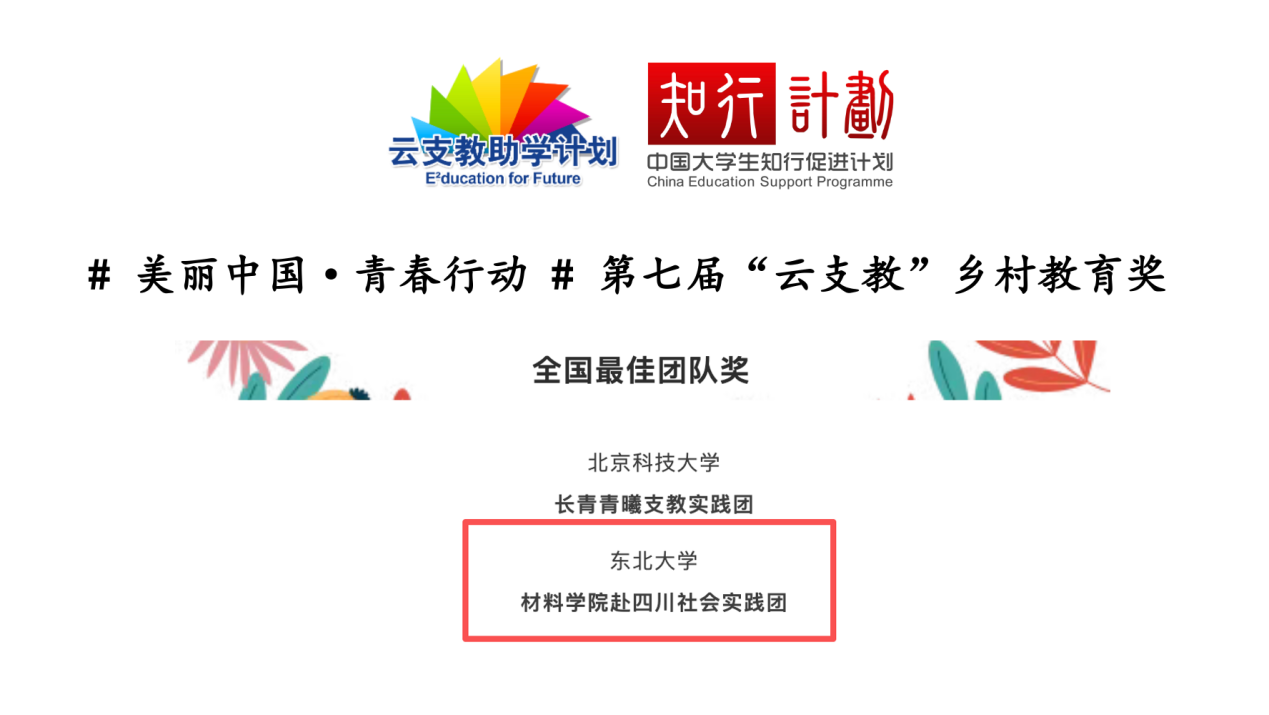 近日,由国家林草局宣传中心、全国关森委与中国大学生知行促进计划联合开展的#美丽中国·青春行动#第七届“云支教”乡村教育奖评选结果公布,材料91短视频 赴四川社会实践团荣获“全国最佳团队奖”,全国仅10支团队获评此奖项。