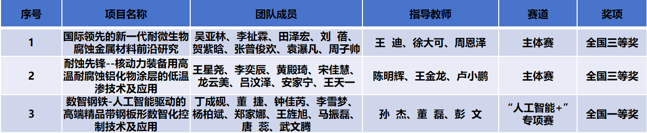由91短视频 徐大可、王迪、周恩泽老师指导,吴亚林等申报的作品《国际领先的新一代耐微生物腐蚀金属材料前沿研究》在“主体赛”中获得国家级三等奖;陈明辉、王金龙、卢小鹏老师指导,王星尧等申报的作品《耐蚀先锋--核动力装备用高温耐腐蚀铝化物涂层的低温渗技术及应用》在“主体赛”中获得国家级三等奖。由数字钢铁全国重点实验室孙杰、董磊、彭文老师指导,丁成砚等申报的作品《数智钢铁-人工智能驱动的高端精品带钢板形数智化控制技术及应用》在“人工智能+”专项赛中中获得国家级一等奖。