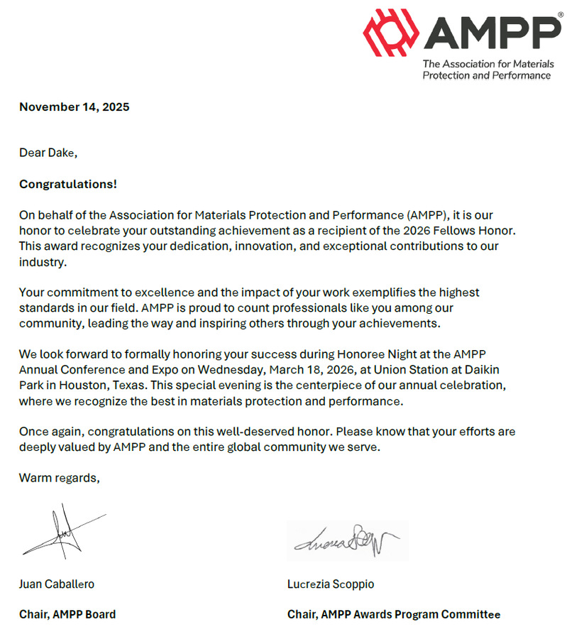 在授予徐大可教授AMPP会士的官方授奖信函中,AMPP董事会主席Juan Caballero及奖项委员会主席Lucrezia Scoppio高度评价其科研贡献,明确指出:“徐大可教授的研究体现了本领域的最高标准,并对全球材料防护领域产生深远影响”。该评价彰显他在微生物腐蚀机理与防护技术方面的卓越贡献,也认可其在推动国际合作、促进全球腐蚀科学交流中的重要作用。